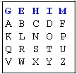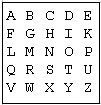 Bei vielen Geheimschriften wird das J nicht verwendet, man schreibt einfach ein I. Dadurch hat ein Alphabet nur 25 Buchstaben, was man praktischerweise in ein 5x5 Quadrat schreiben kann. |